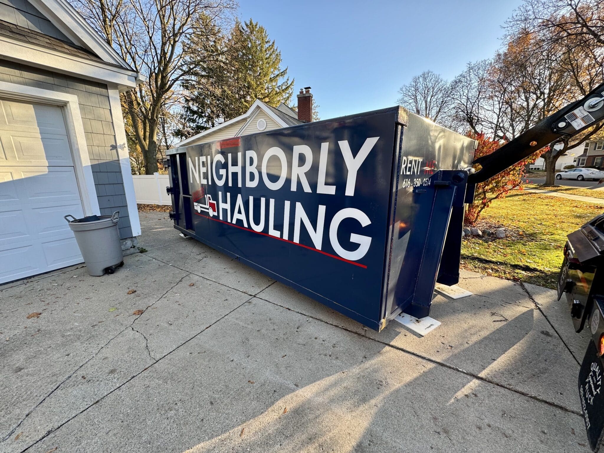 Neighborly Hauling delivers dumpster rentals in Caledonia for homeowners, remodelers, and contractors throughout Caledonia Township. Caledonia is one of the fastest-growing communities in southern Kent County — a rural-suburban mix of larger lots, newer subdivisions, and established farmsteads being renovated or cleared out. Whether it’s a kitchen remodel, a barn cleanout, or new construction debris along the M-37 corridor, we have the right bin for the job. Every rental includes HDPE driveway protection and upfront pricing starting at $249 — with online booking available 24/7 and transparent pricing on everything. Choose from 12, 17, 21 and 25 yard dumpsters with flexible 3–28 day rentals.