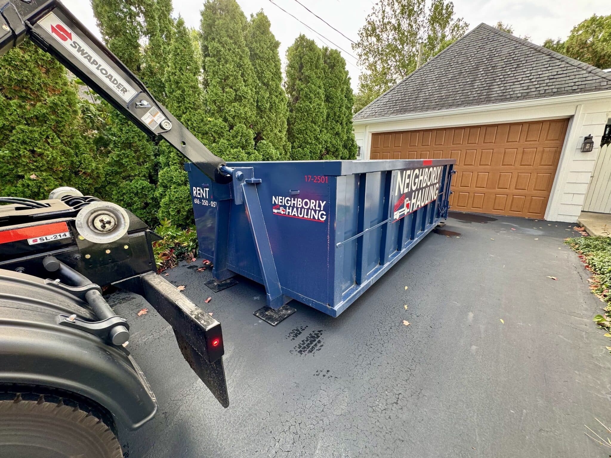 We deliver throughout East Grand Rapids including along Lake Drive SE, Reeds Lake Boulevard, Robinson Road SE, Plymouth SE, and neighborhoods near Gaslight Village and Wealthy Street. EGR driveways range from wide circular drives on the lake-side properties to narrower lots closer to the city center — our 17 yard fits tighter spots, while the 21 and 25 yard handle the bigger renovation jobs this city generates. Driveway protection is included with every delivery — we’re especially careful on EGR’s older brick and aggregate concrete surfaces.
